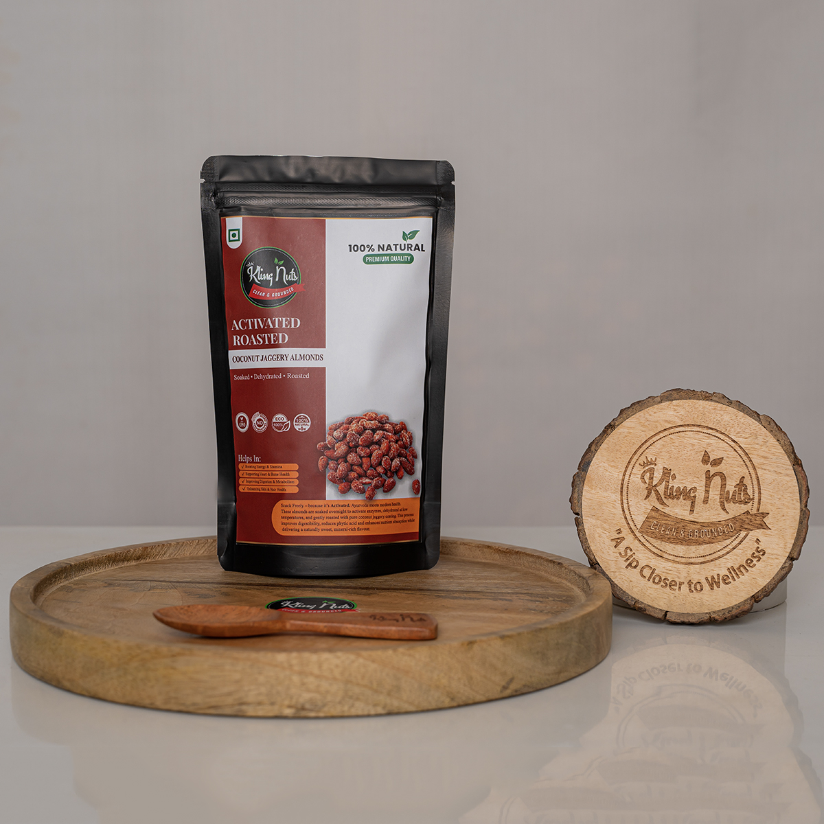 Snack mindfully with this nutritious fusion of activated almonds, coconut, and jaggery. Each almond is soaked, dried, and roasted for optimal digestibility and crunch. Infused with the earthy sweetness of jaggery and the tropical flavor of coconut, this snack balances taste and wellness — delivering energy, iron, and antioxidants with every bite.