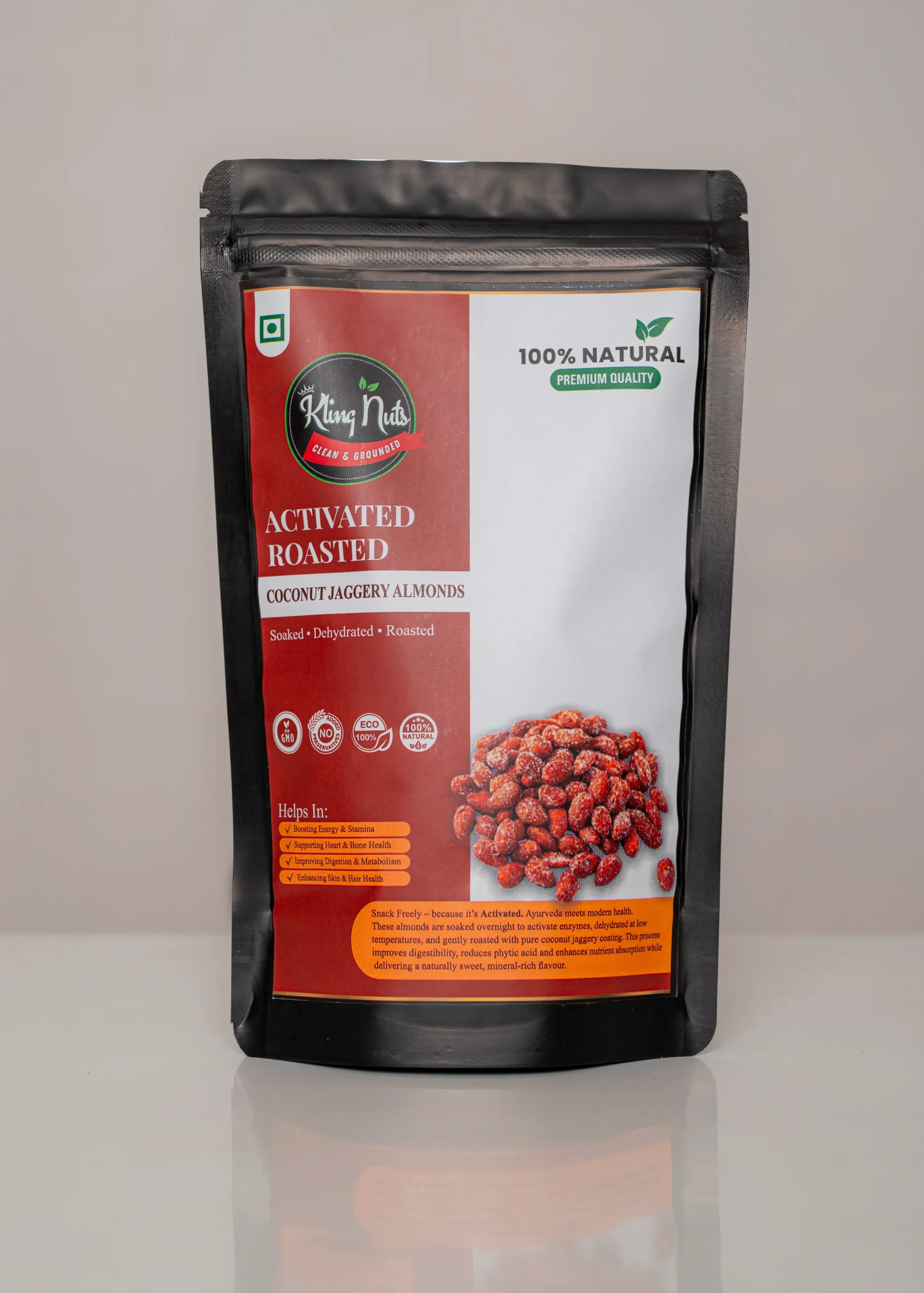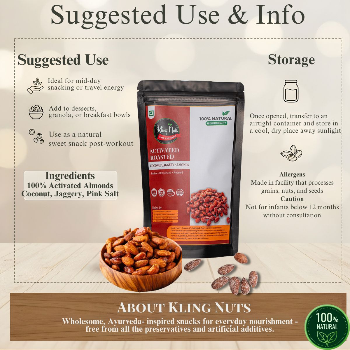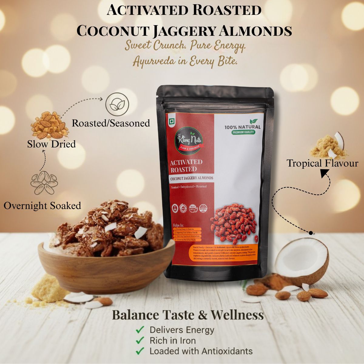 Kling Nuts Activated Roasted Coconut Jaggery Almonds combine soaked, dried, and roasted almonds with coconut and jaggery for guilt-free, energy-boosting, digestion-supporting, naturally wholesome snacking.