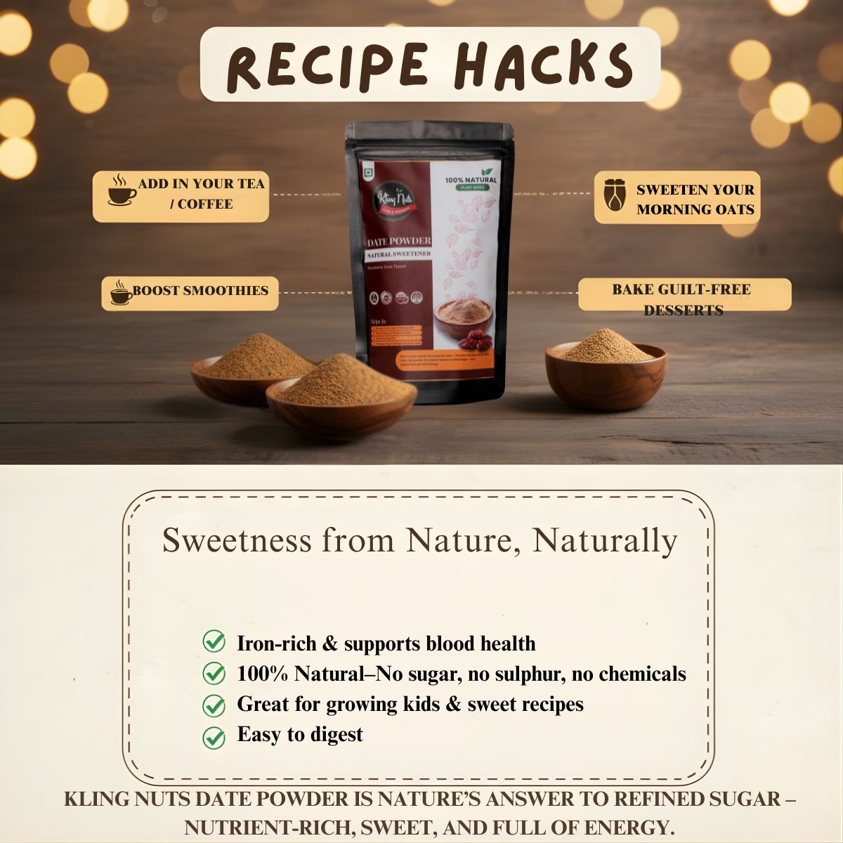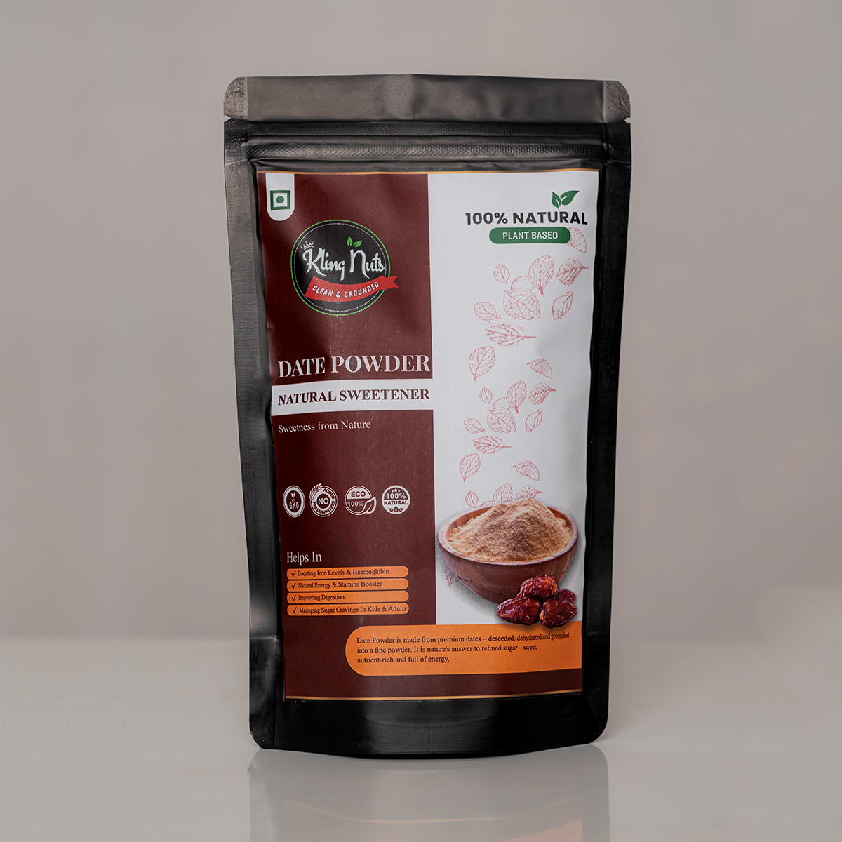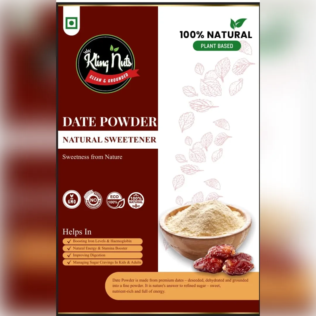 Kling Nuts Date Powder—100% natural sweetener from deseeded, dehydrated dates. Packed with energy, iron, and fiber, perfect for healthy cooking, smoothies, desserts, or natural skincare.