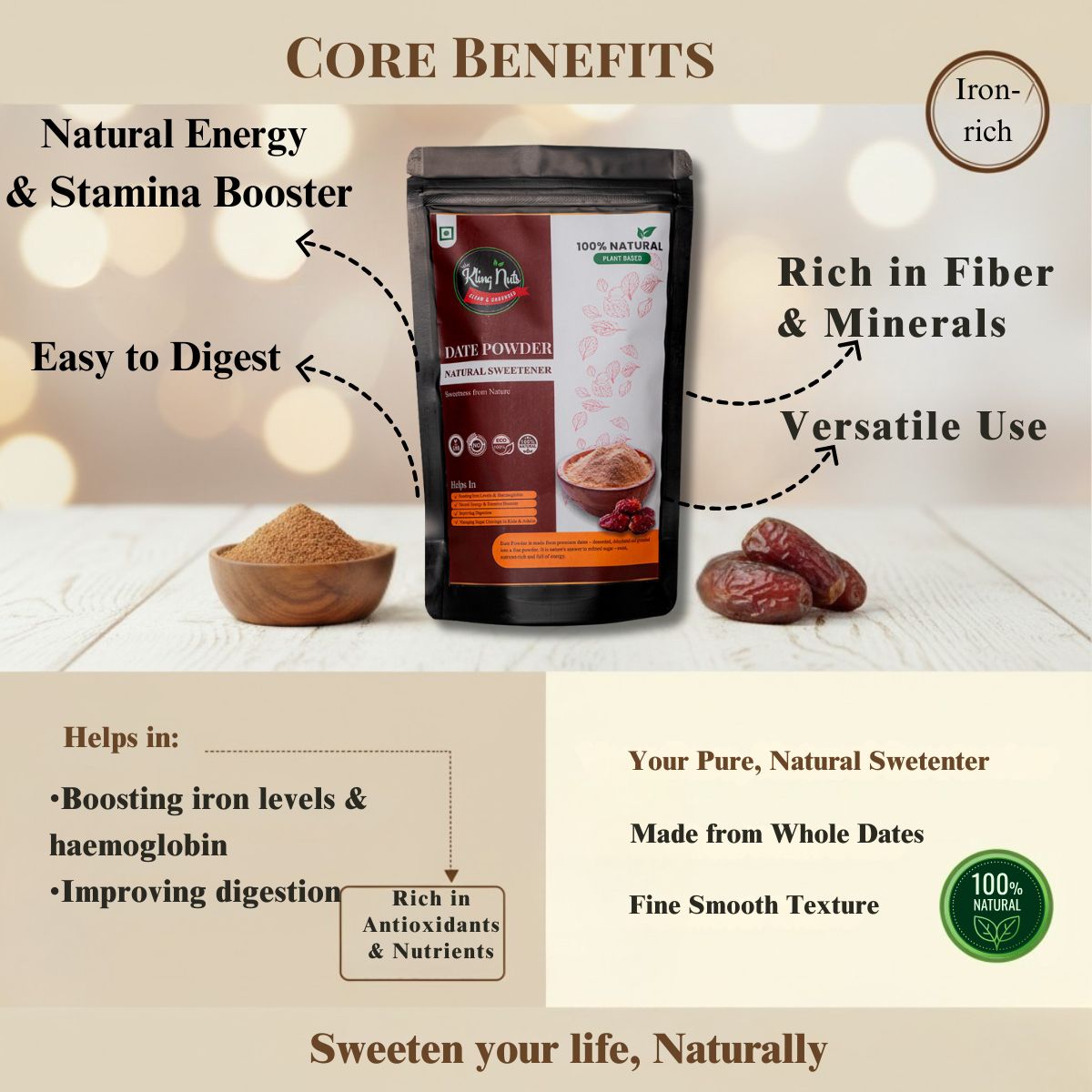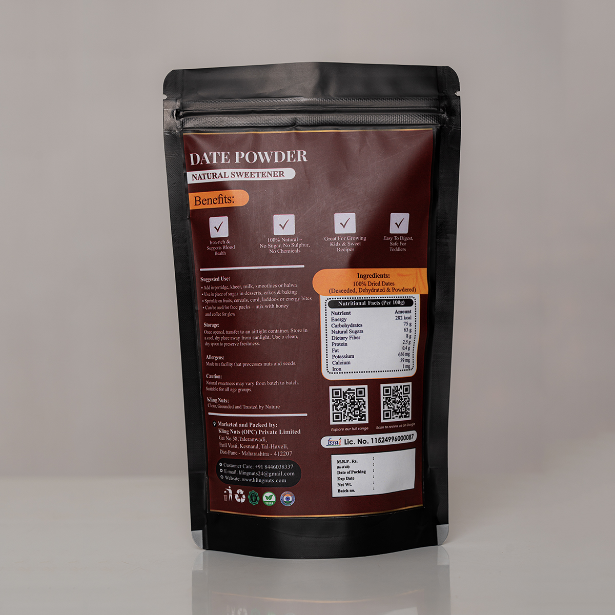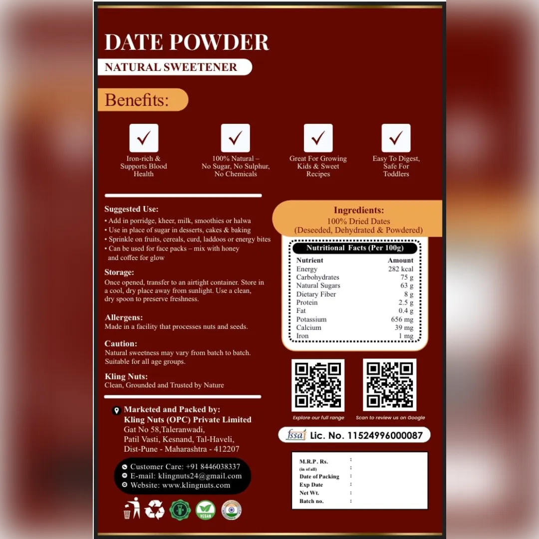 Kling Nuts Date Powder—100% natural sweetener from deseeded, dehydrated dates. Packed with energy, iron, and fiber, perfect for healthy cooking, smoothies, desserts, or natural skincare.