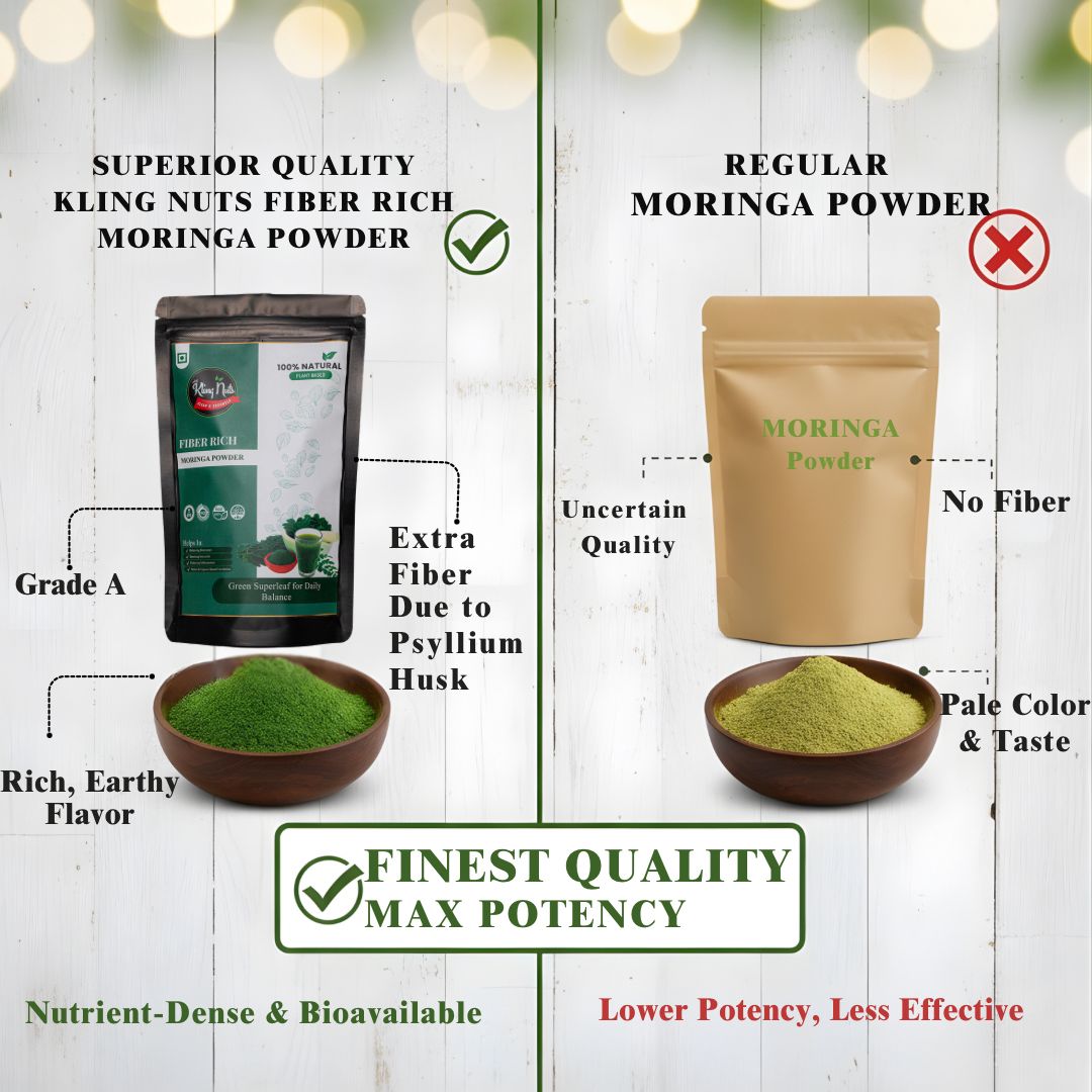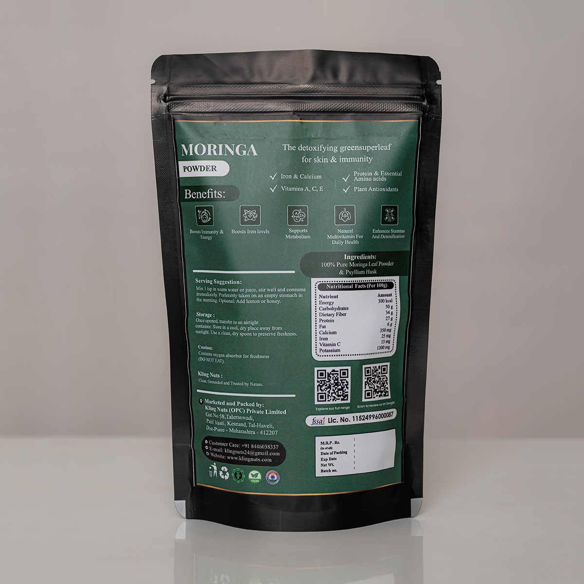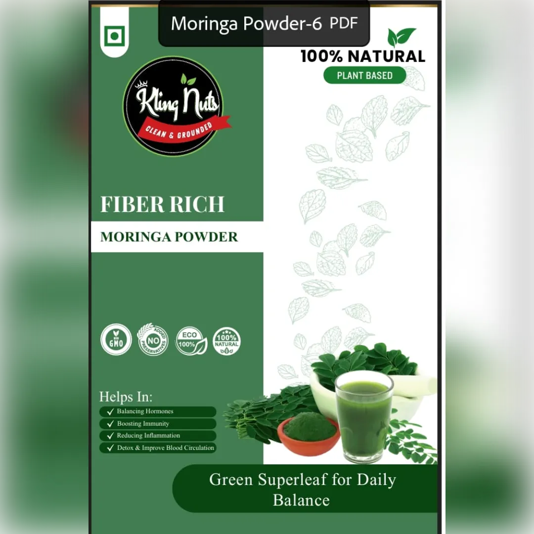 Kling Nuts Fiber Rich Moringa Powder is a powerhouse of nutrients designed to detoxify, energize, and nourish your body from within. Enriched with iron, calcium, and plant-based antioxidants, it serves as a natural multivitamin for daily balance and vitality.