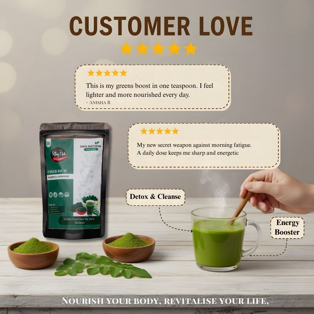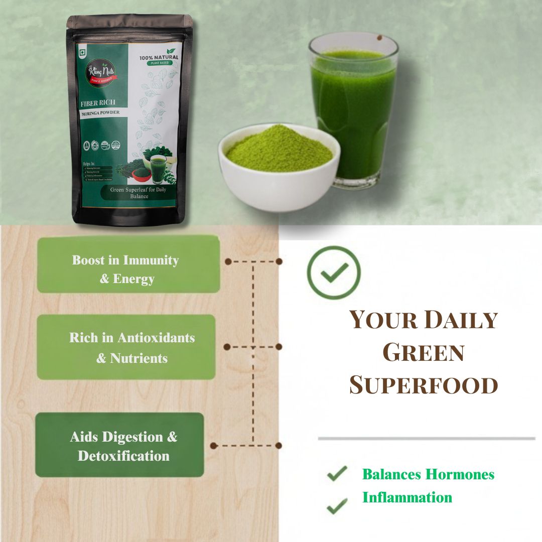 Fiber-rich Moringa Powder, a green superleaf packed with vitamins, minerals, protein, and amino acids. Supports energy, immunity, hormone balance, and overall wellness. 100% natural and preservative-free.