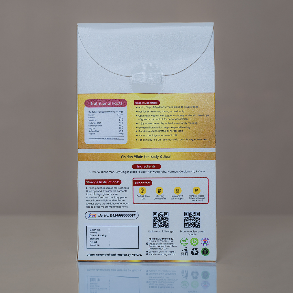 A warming, wellness-packed blend of Turmeric, Ginger, Black Pepper, Ashwagandha, Nutmeg, Cardamom, Saffron, and Cinnamon—100% natural, supporting immunity, reducing inflammation, with no preservatives.